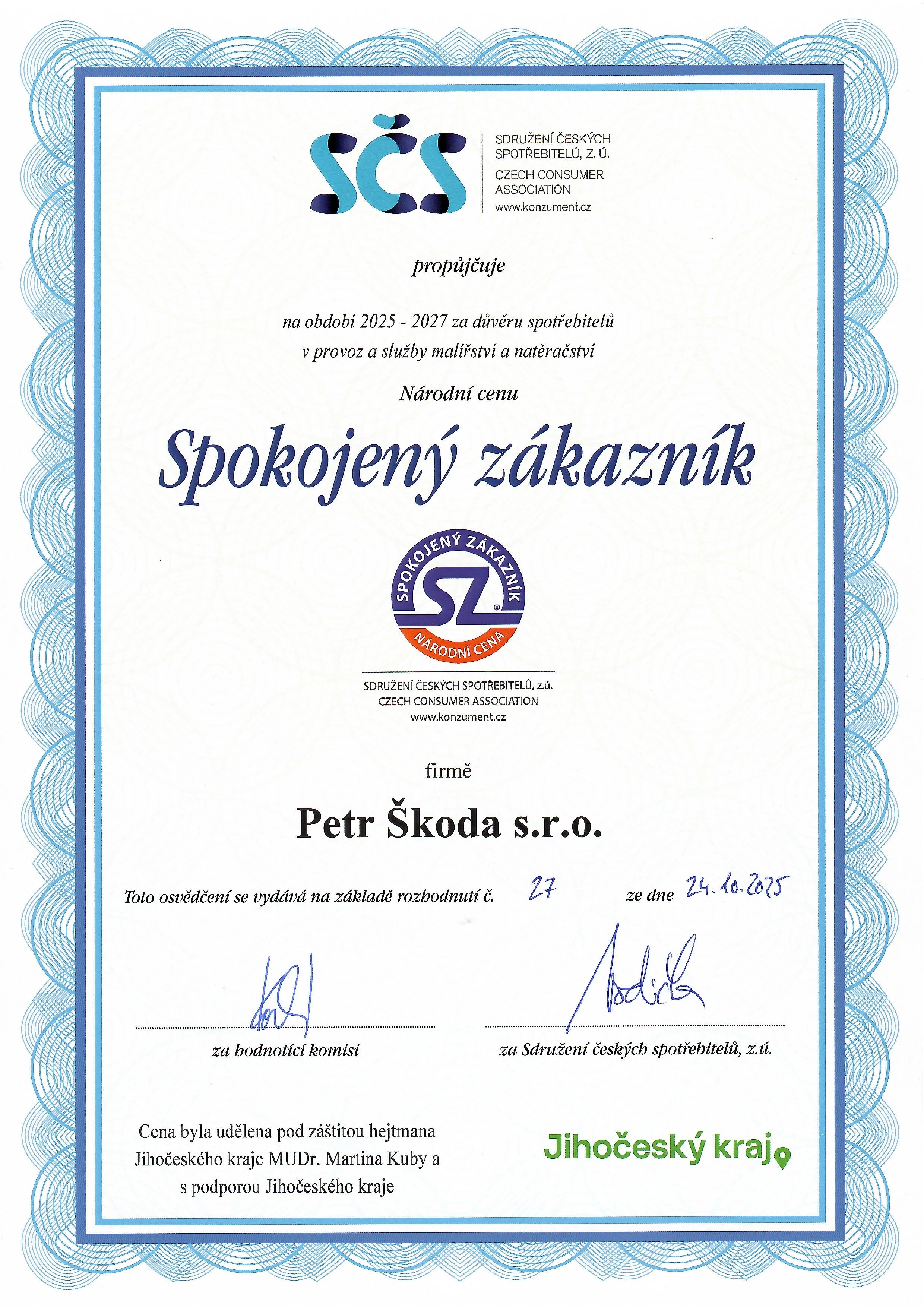 V roce 2025 jsme s hrdostí získali ocenění Spokojený zákazník Jihočeského kraje. Tohoto uznání si velmi vážíme neboť je potvrzením naší poctivé práce, spolehlivosti a spokojenosti našich zákazníků.